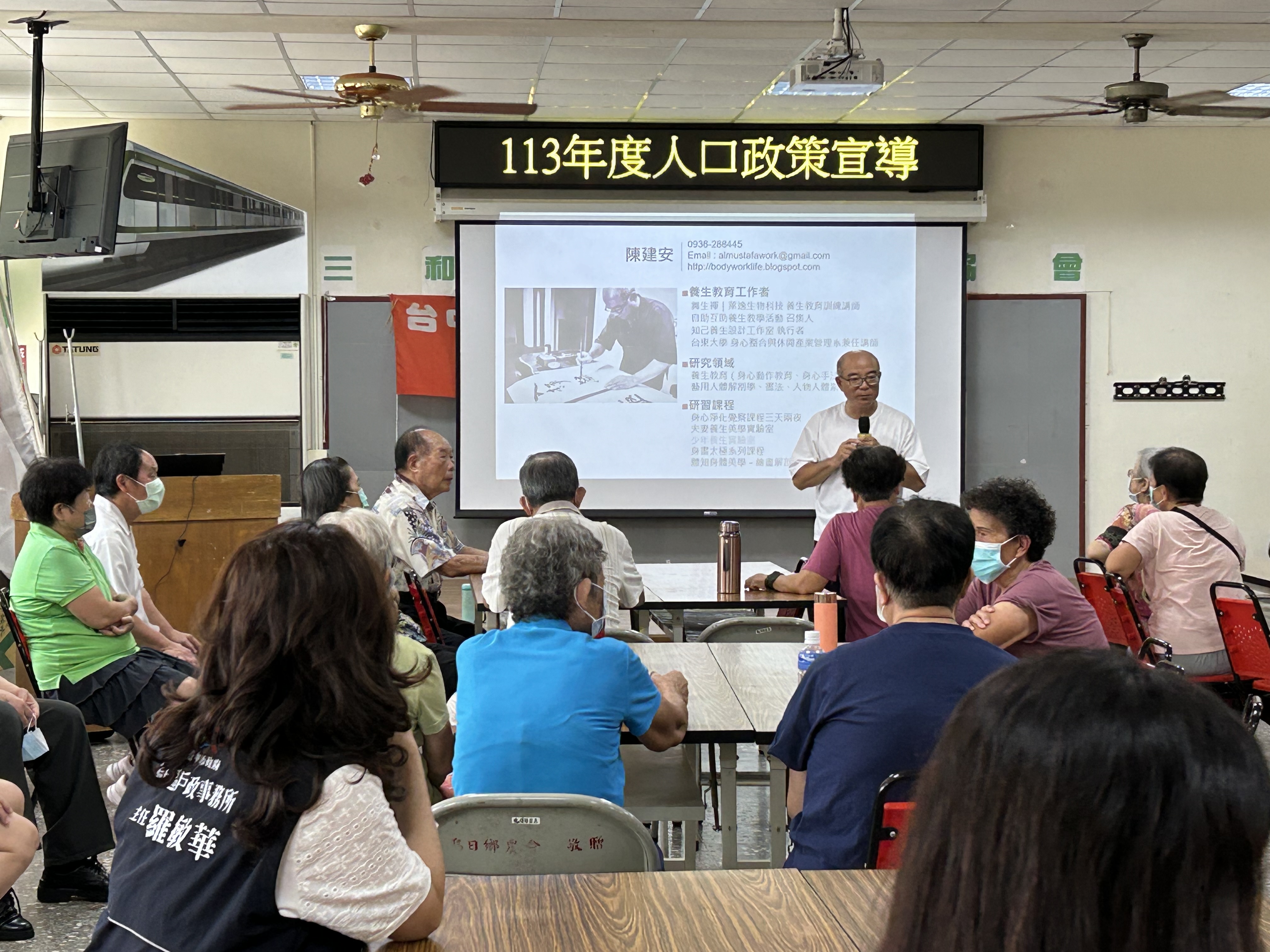 《守「戶」健康,樂齡舒壓兜陣來》 本所於9月4日上午在三和社區活動中心舉辦人口政策宣導活動,邀請講師陳建安講授按摩保健常識,並與勞工局合作,聘請視障按摩師為長者進行穴位按摩。 講師並帶領長者進行簡單的保健操,介紹重要的穴位,示範正確的按摩技巧,獲得了與會長者的熱烈響應。 簡單的居家健康操,使長者們能在家隨時活動,保持青春和健康。活動圓滿完成,期待各位長輩活到老、學到老,過上健康幸福的百歲人生。