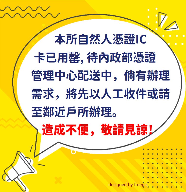 本所自然人憑證IC卡已用罄,正待內政部憑證管理中心配送中,倘有辦理需求,請您至鄰近戶所辦理。