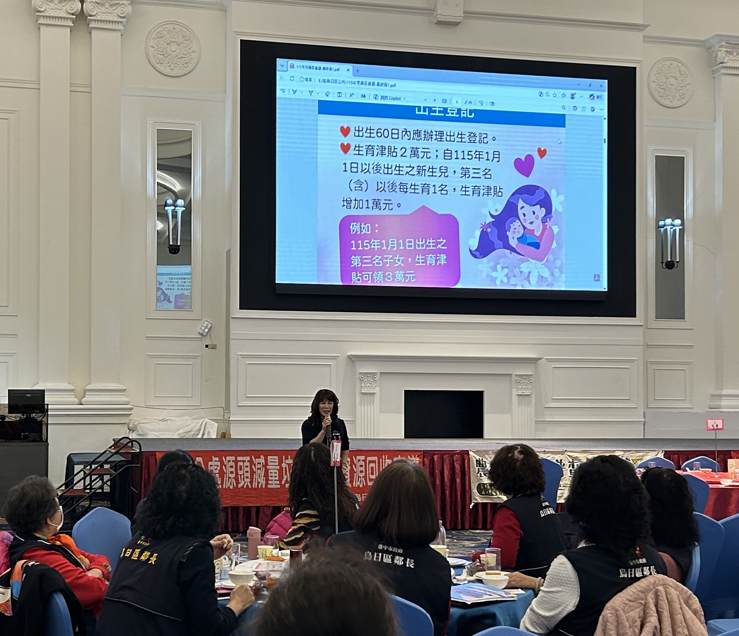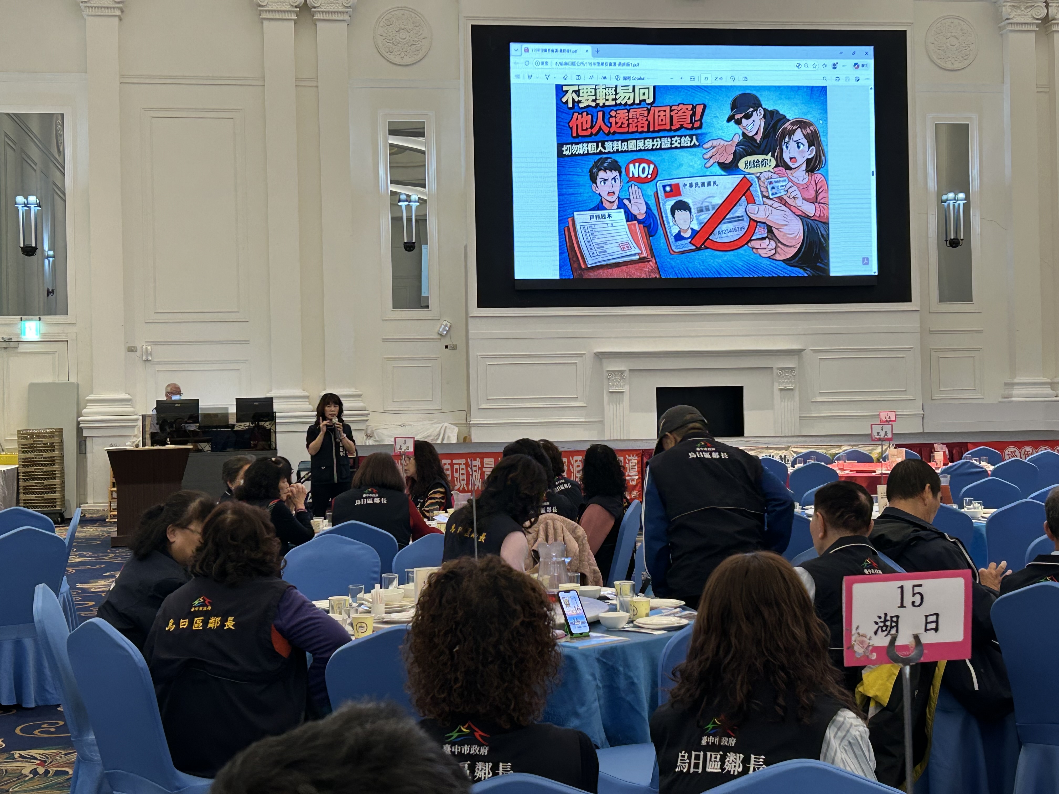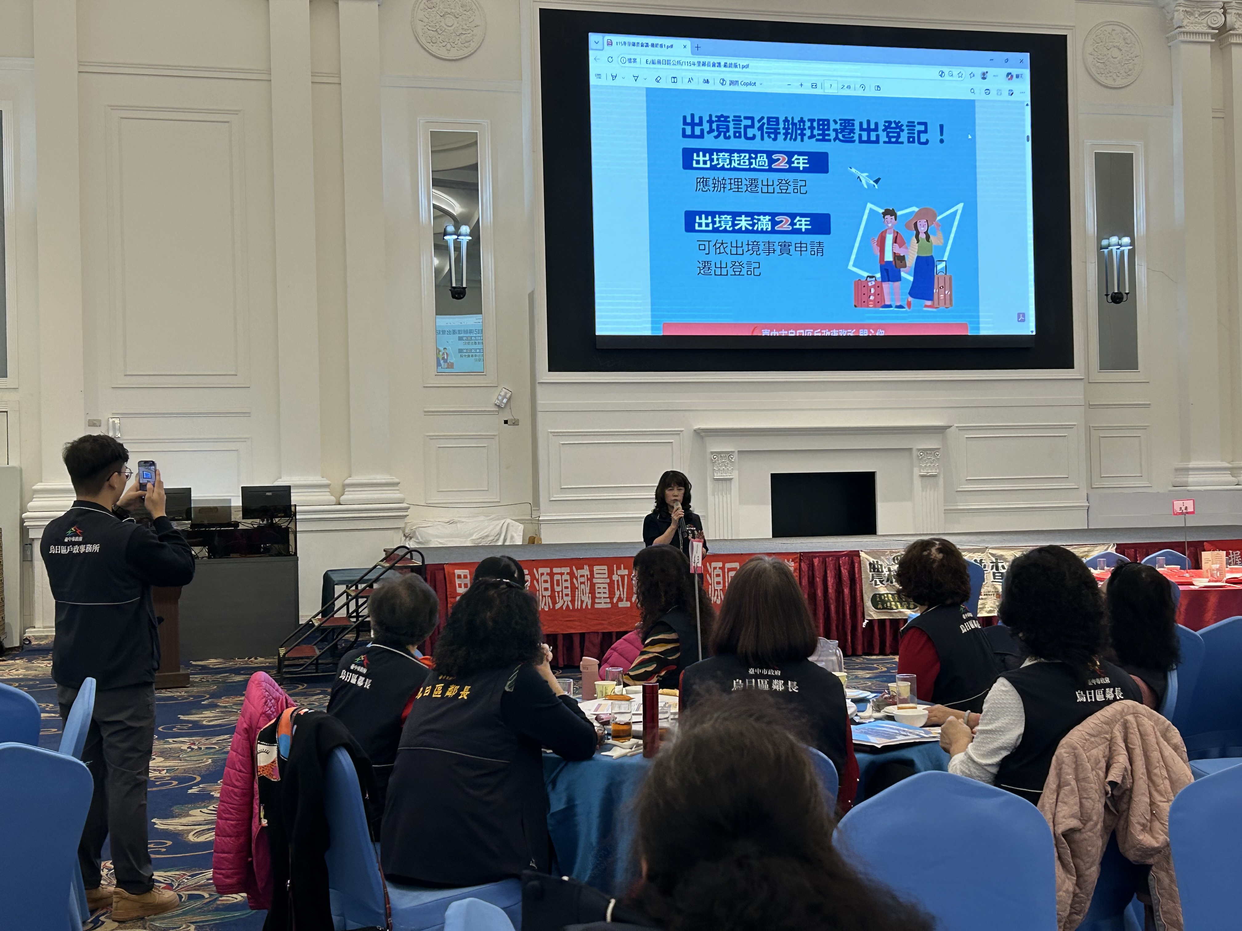 今日烏日區公所舉辦「115年度里鄰長研習會」,本所由羅主任上台進行戶政業務宣導,向平時與民眾接觸最密切、最辛勞的里鄰長們介紹最新的戶政便民服務措施,讓各項服務資訊能更即時傳達給市民朋友。